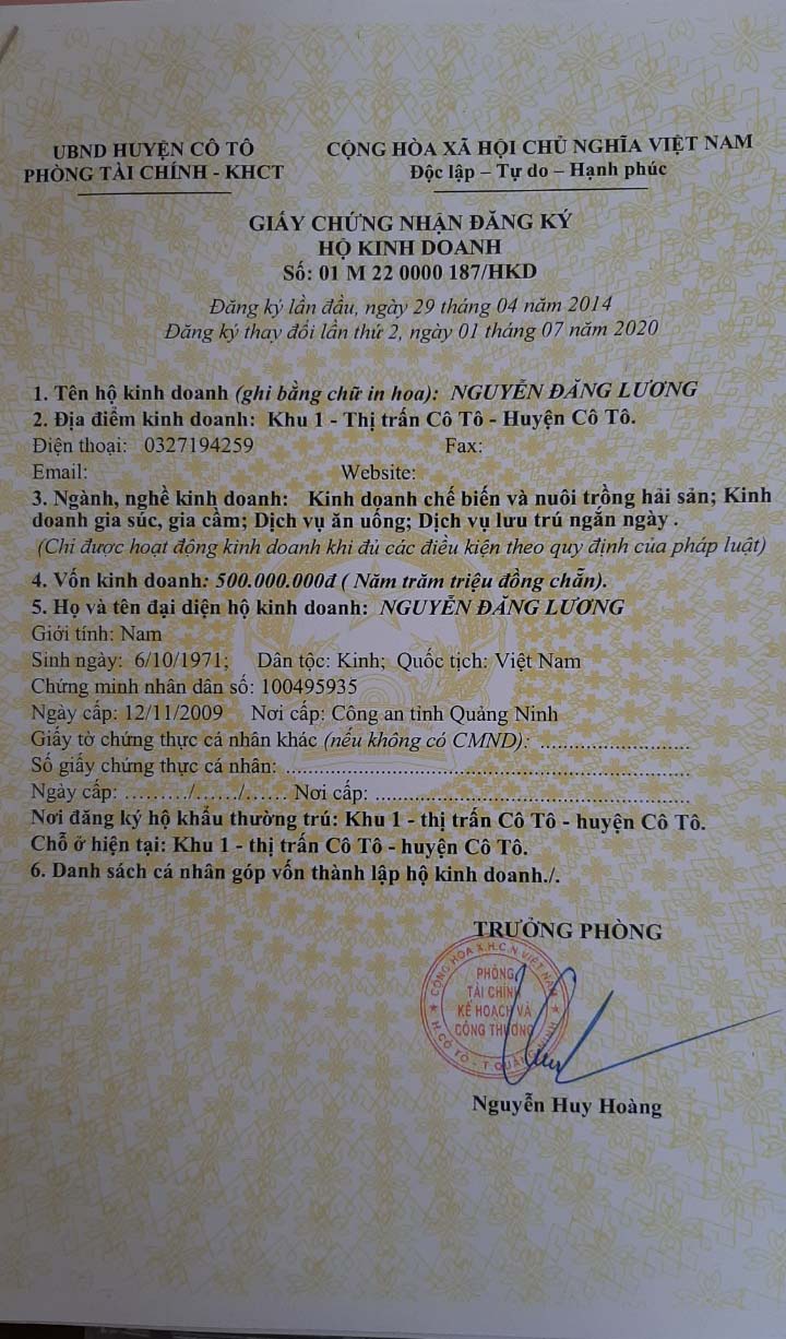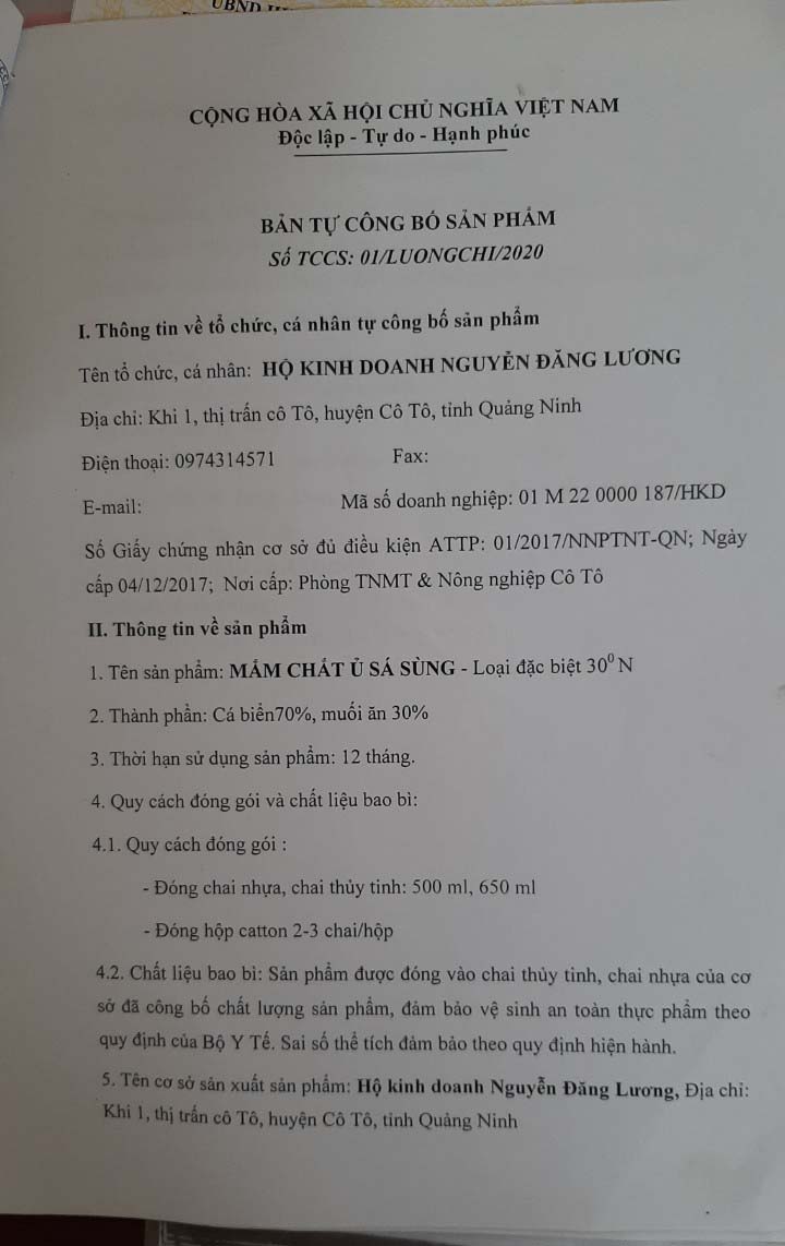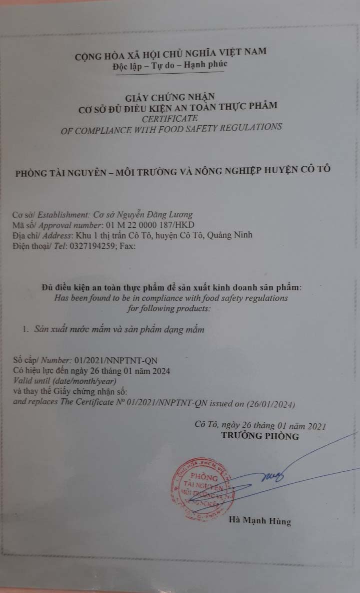 Cơ sở Nguyễn Đăng Lương – HTX nước mắm Cô Tô Địa chỉ: Khu 1 thị trấn Cô Tô huyện Cô Tô SĐT: 0327194259