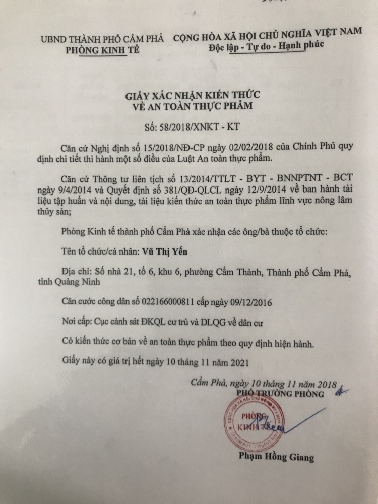 SN 21, tổ 6, khu 6 phường Cẩm Thành, TP. Cẩm Phả, Quảng Ninh