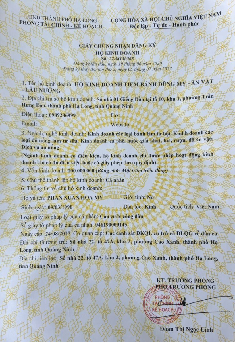 Tên đơn vị/nhà sản xuất: HỘ KINH DOANH TIỆM BÁNH DŨNG MY - ĂN VẶT - LẨU NƯỚNG