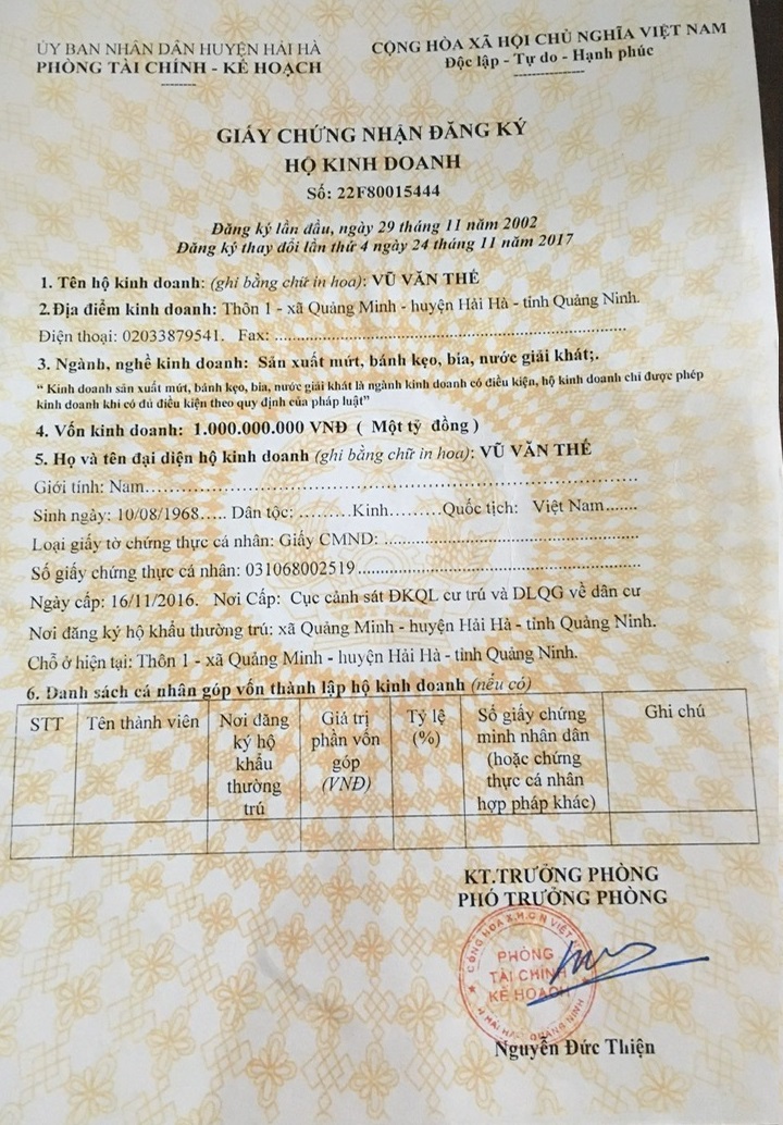 Tên đơn vị/nhà sản xuất: Hộ kinh doanh Vũ Văn Thế