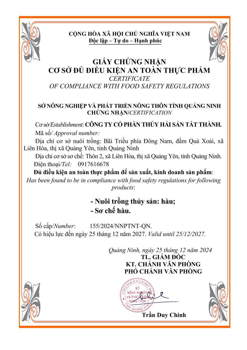 Tên đơn vị/nhà sản xuất: Công ty cổ phần thủy hải sản Tất Thành