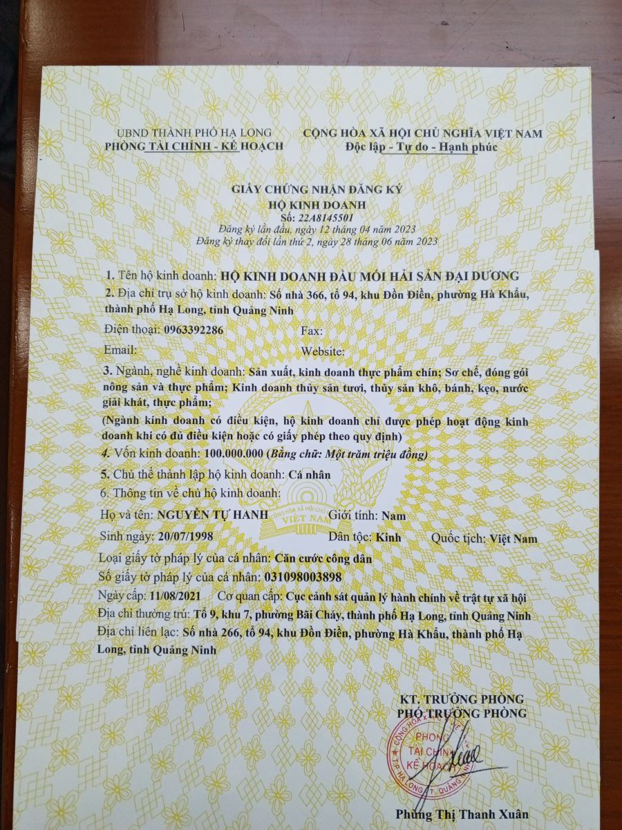 Tên đơn vị/nhà sản xuất: HỘ KINH DOANH ĐẦU MỐI HẢI SẢN ĐẠI DƯƠNG