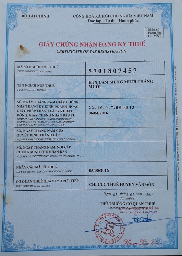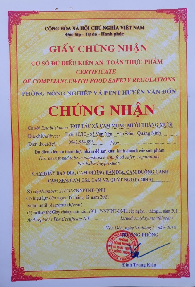 Tên đơn vị/nhà sản xuất: HTX Cam Mùng Mười Tháng Mười