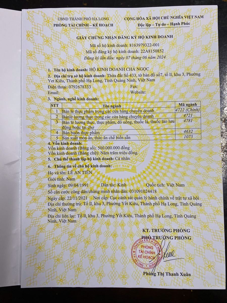 Tên đơn vị/nhà sản xuất: HỘ KINH DOANH CHẢ NGỌC