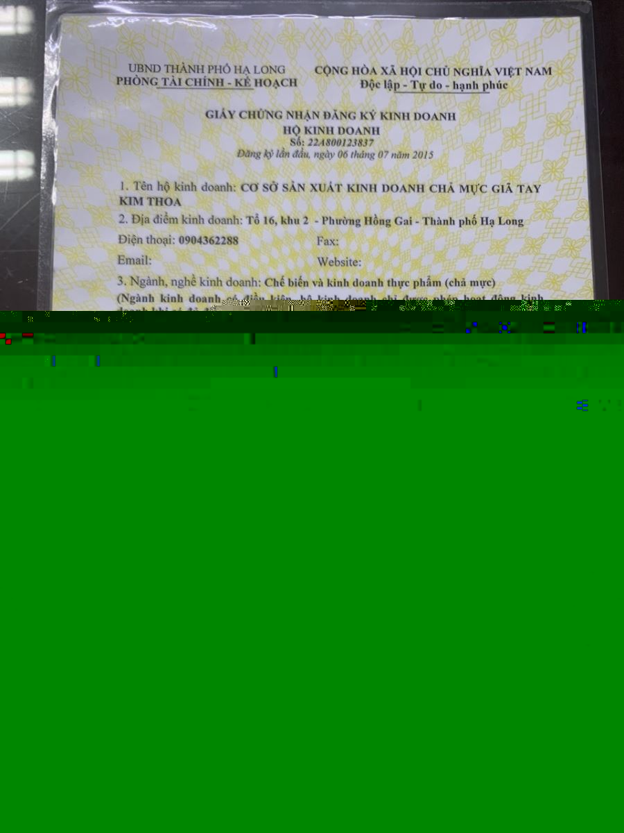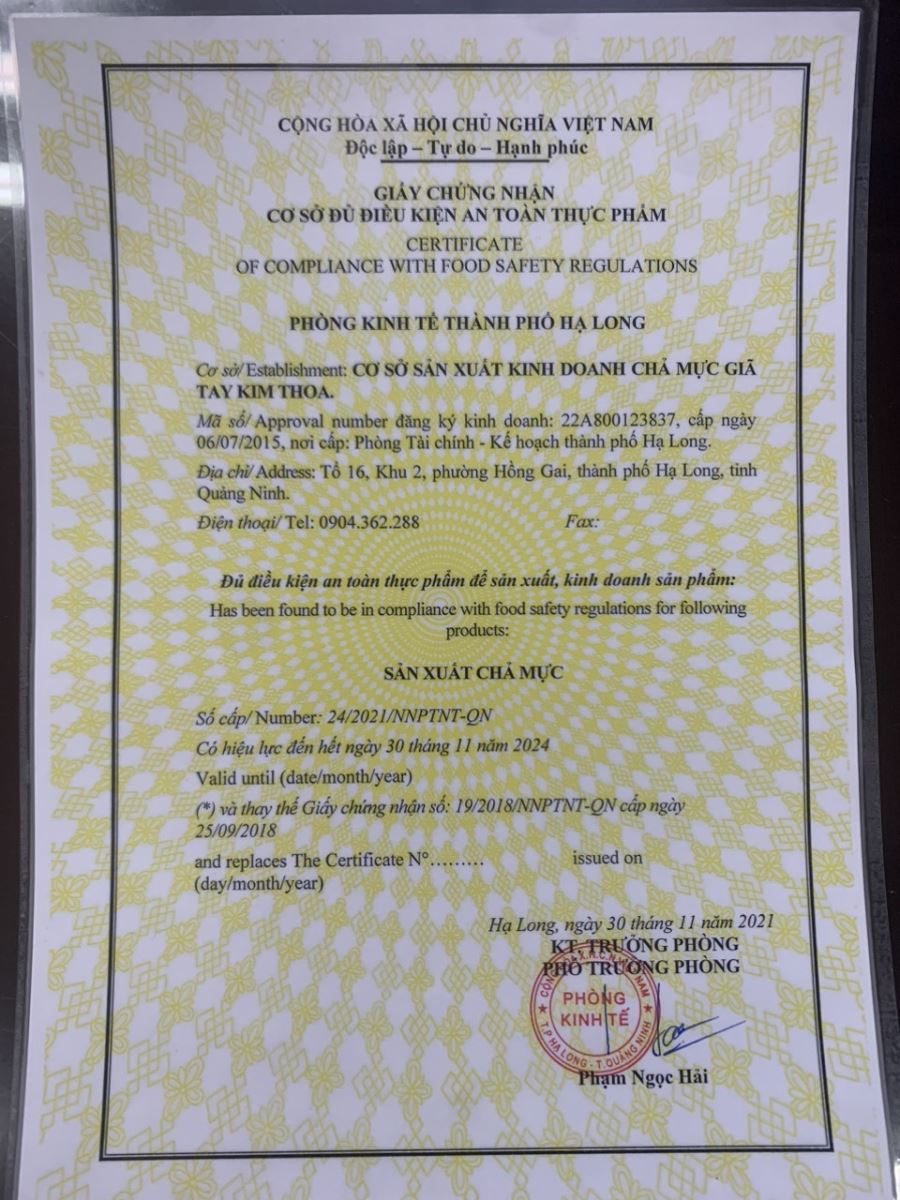 Tên đơn vị/nhà sản xuất: CƠ SỞ SẢN XUẤT KINH DOANH CHẢ MỰC GIÃ TAY KIM THOA