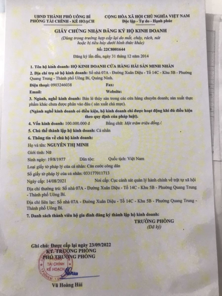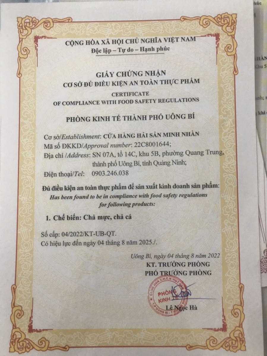 Tên đơn vị/nhà sản xuất: Hộ kinh doanh cửa hàng hải sản Minh Nhàn