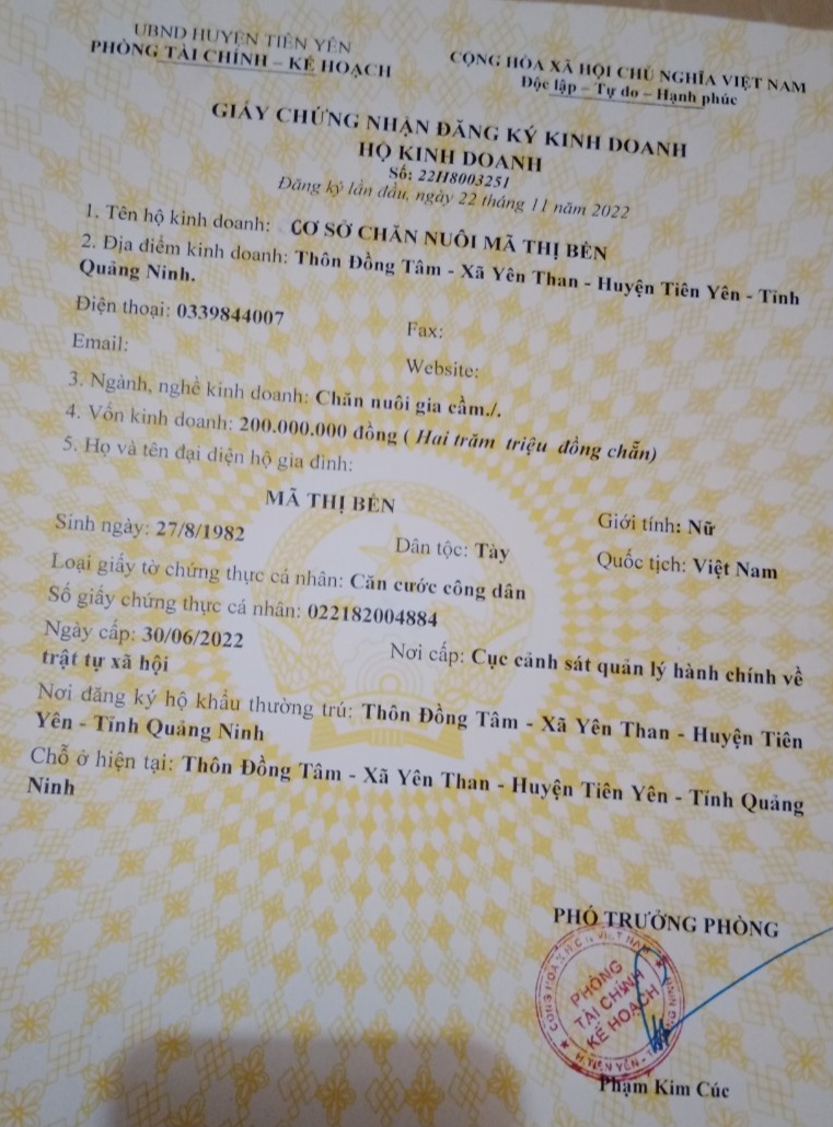 Tên đơn vị/nhà sản xuất: Cơ sở chăn nuôi Mã Thị Bền