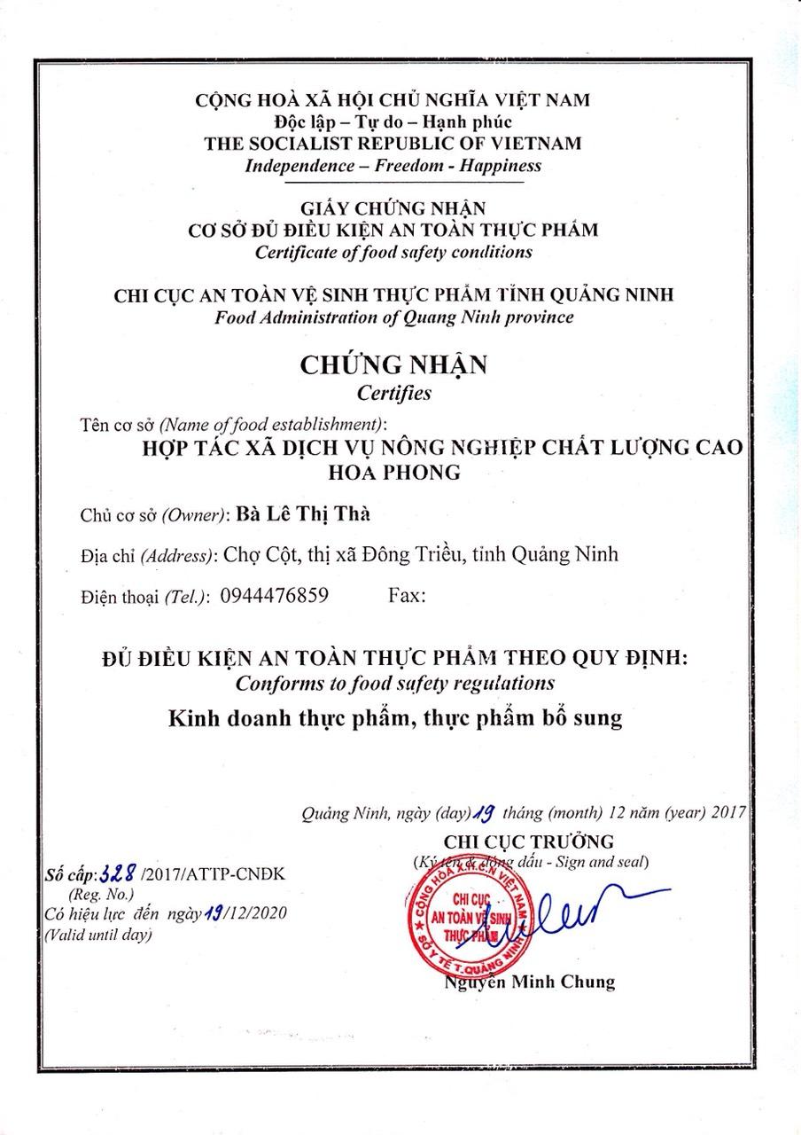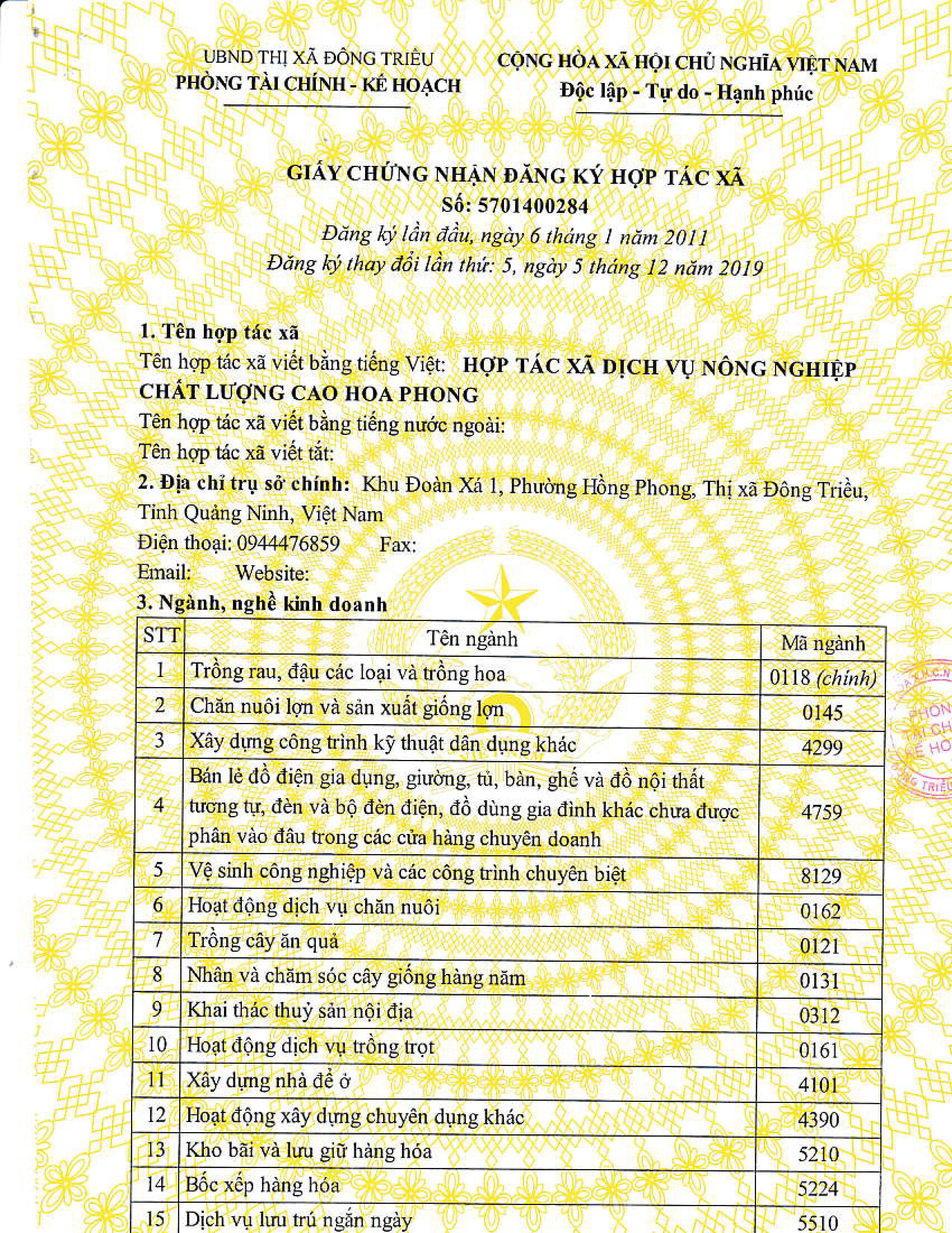 Tên đơn vị/nhà sản xuất: Hợp tác xã Dịch vụ nông nghiệp chất lượng cao Hoa Phong