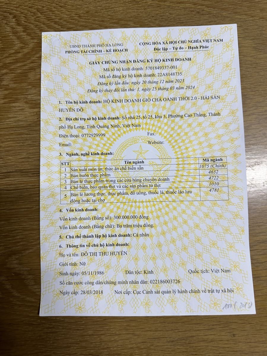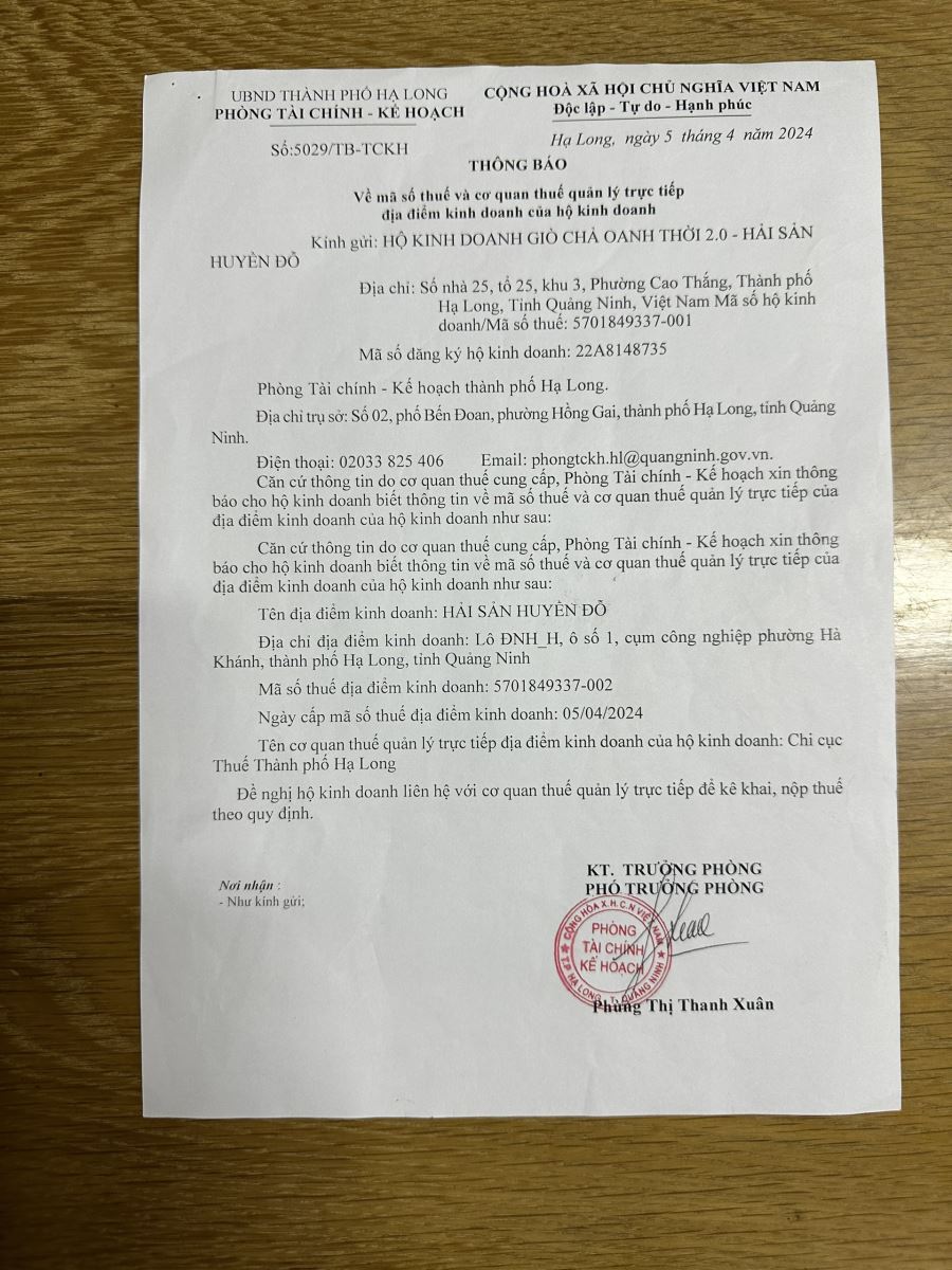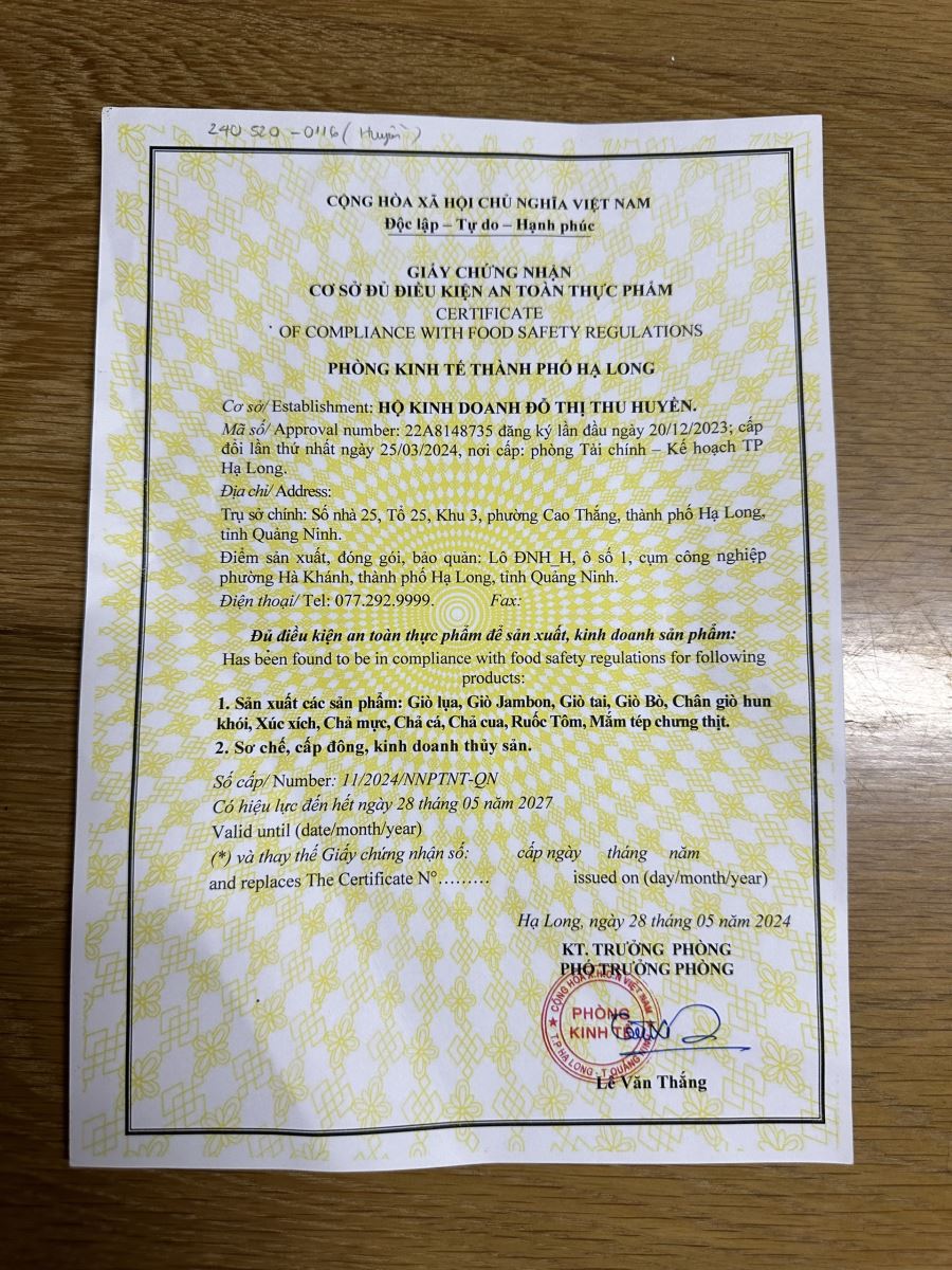 Tên đơn vị/nhà sản xuất: HỘ KINH DOANH GIÒ CHẢ OANH THỜI 2.0 - HẢI SẢN HUYỀN ĐỖ