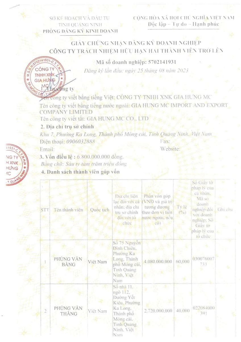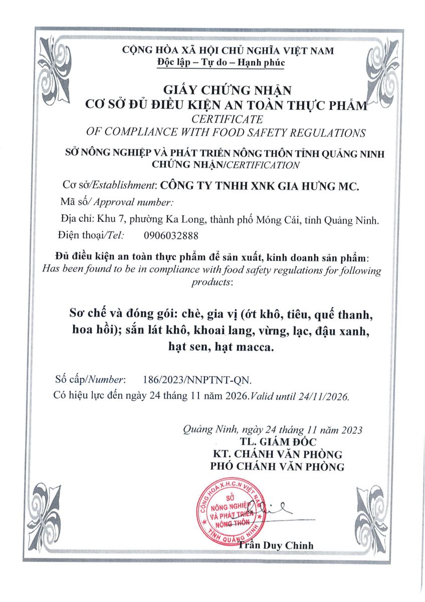 Tên đơn vị/nhà sản xuất: Công ty TNHH XNK Gia Hưng MC
