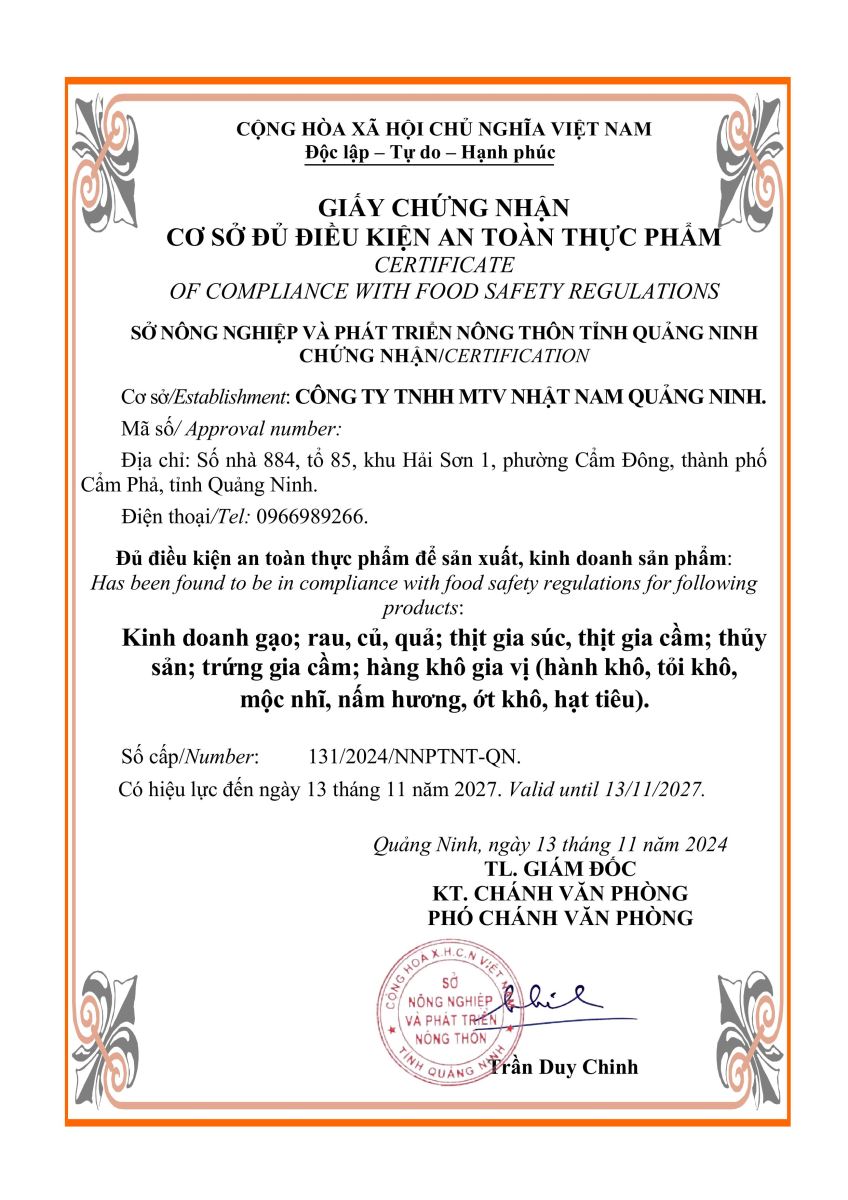 Tên đơn vị/nhà sản xuất: Công ty TNHH MTV Nhật Nam Quảng Ninh