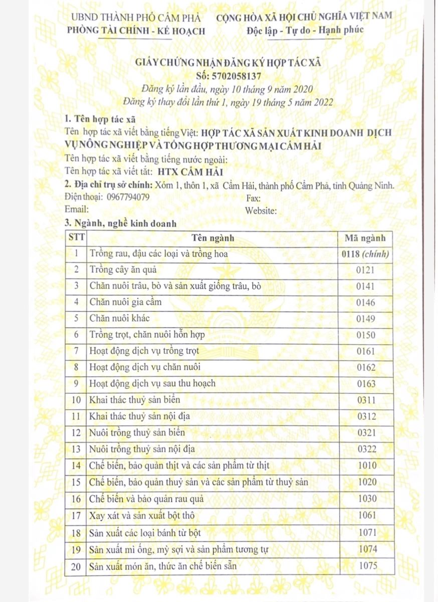 Tên đơn vị/nhà sản xuất: HTX sản xuất kinh doanh DVNN và tổng hợp thương mại Cẩm Hải