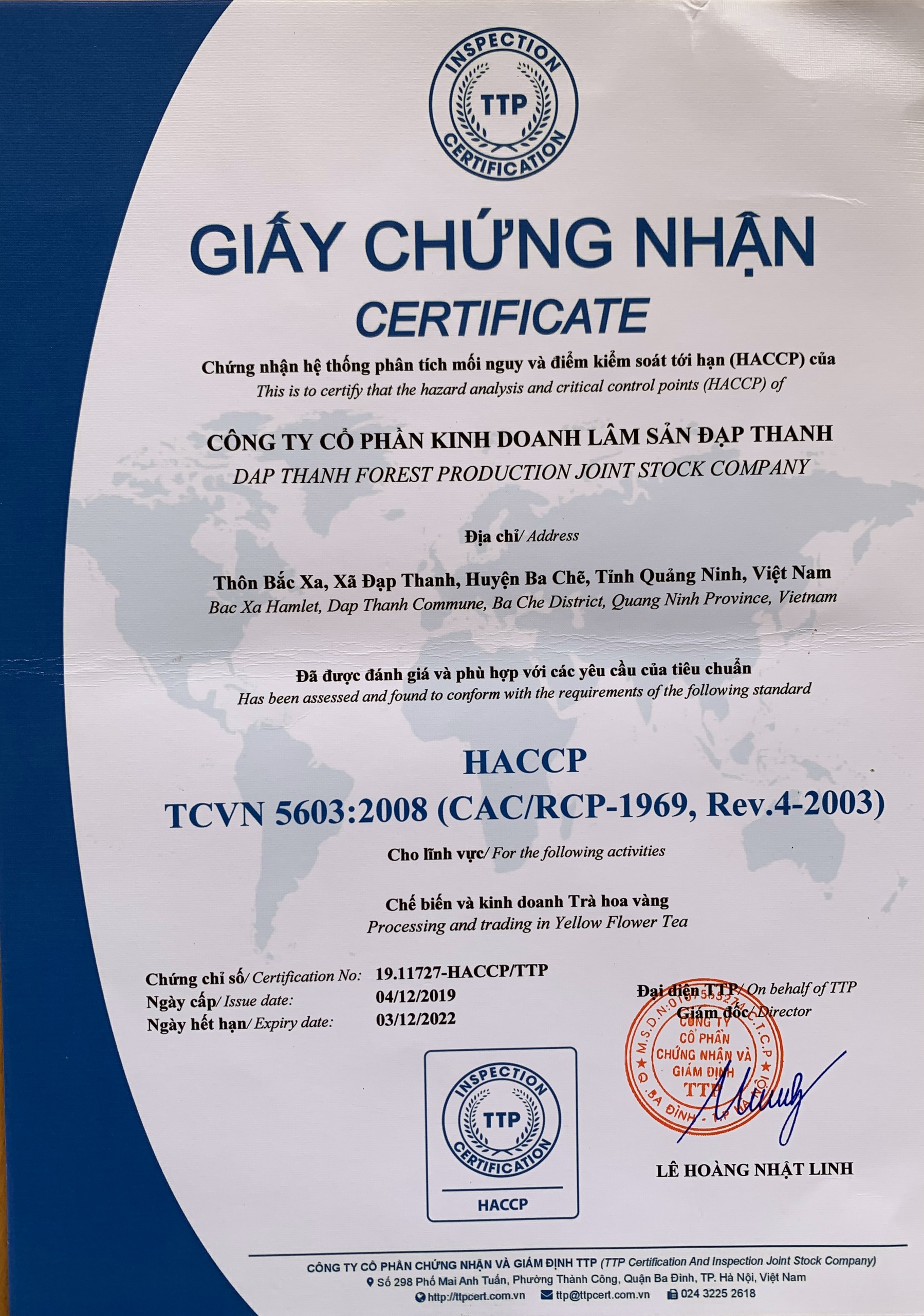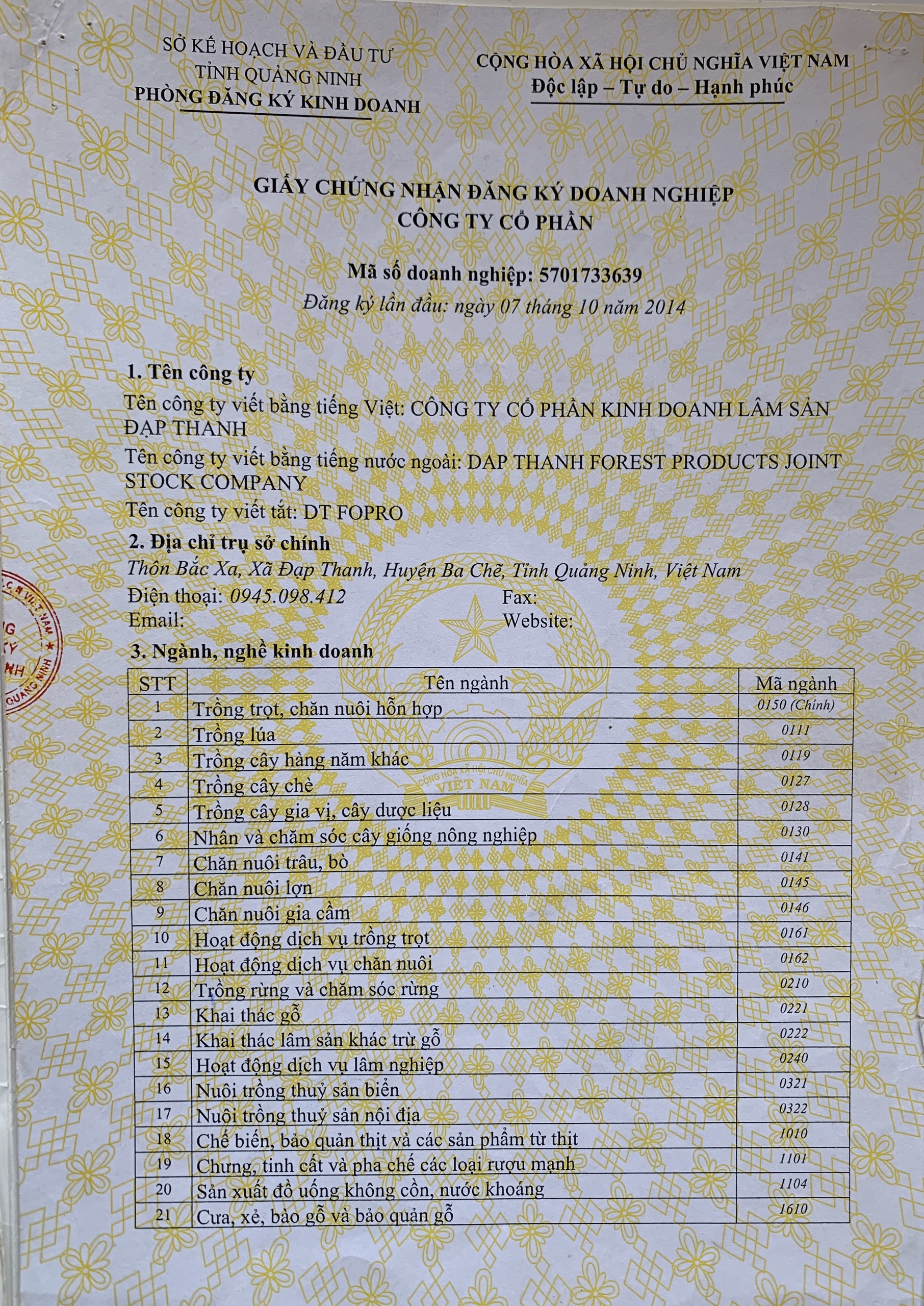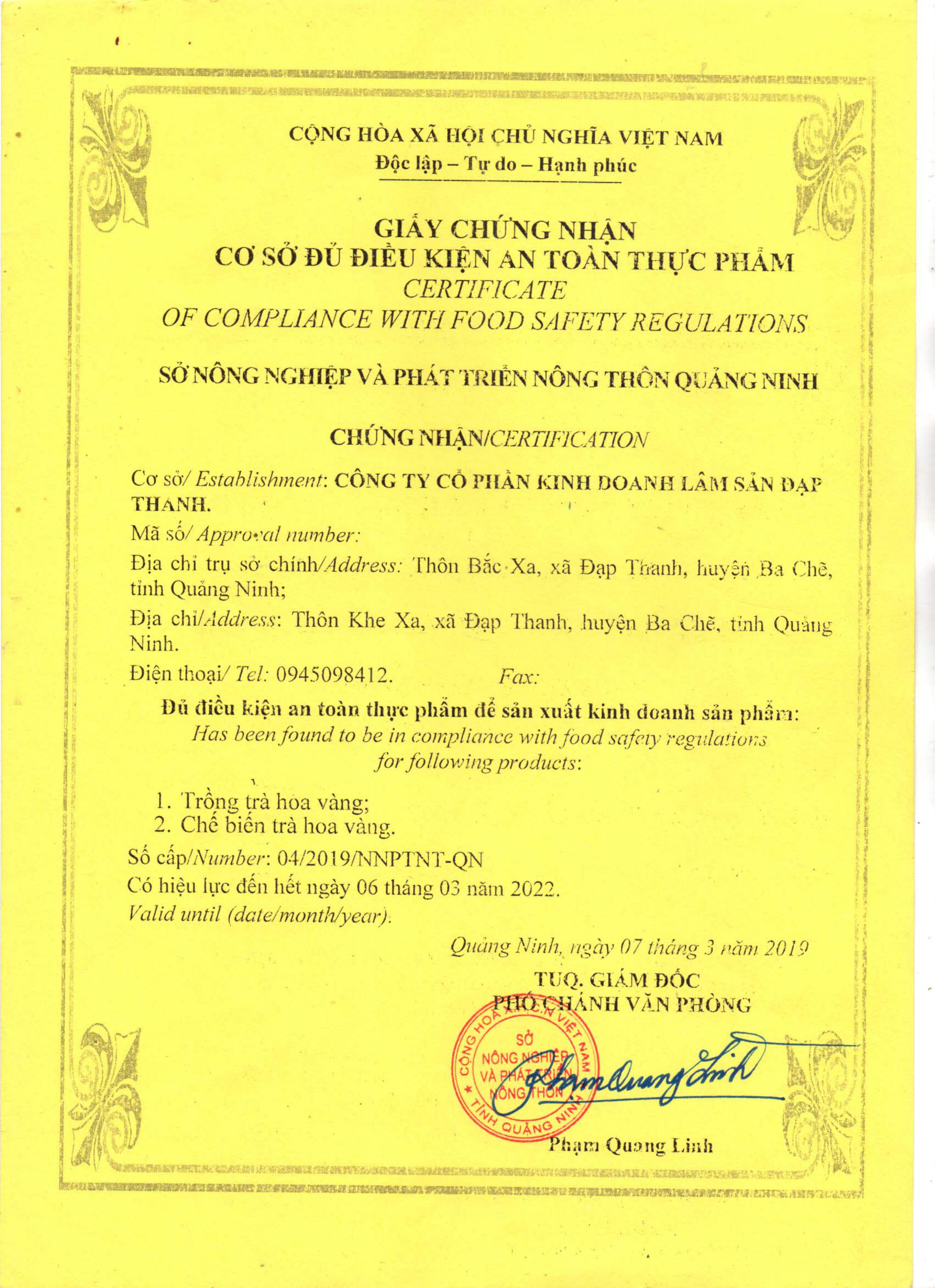 Tên đơn vị/nhà sản xuất: Công ty Cổ phần kinh doanh lâm sản Đạp Thanh