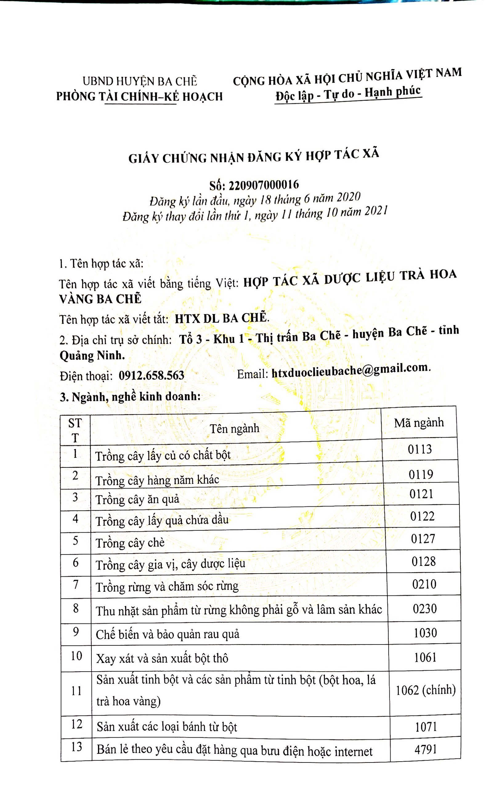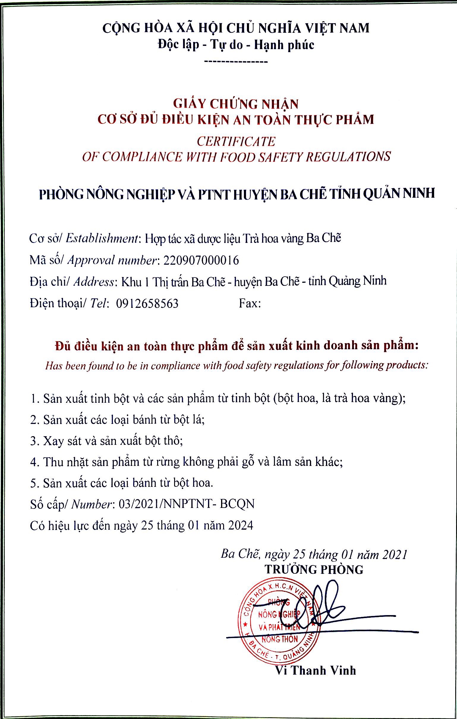 Tên đơn vị/nhà sản xuất: Hợp tác xã dược liệu trà hoa vàng Ba Chẽ