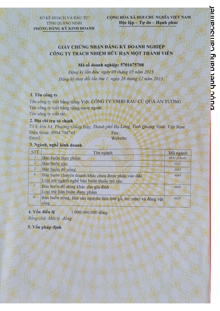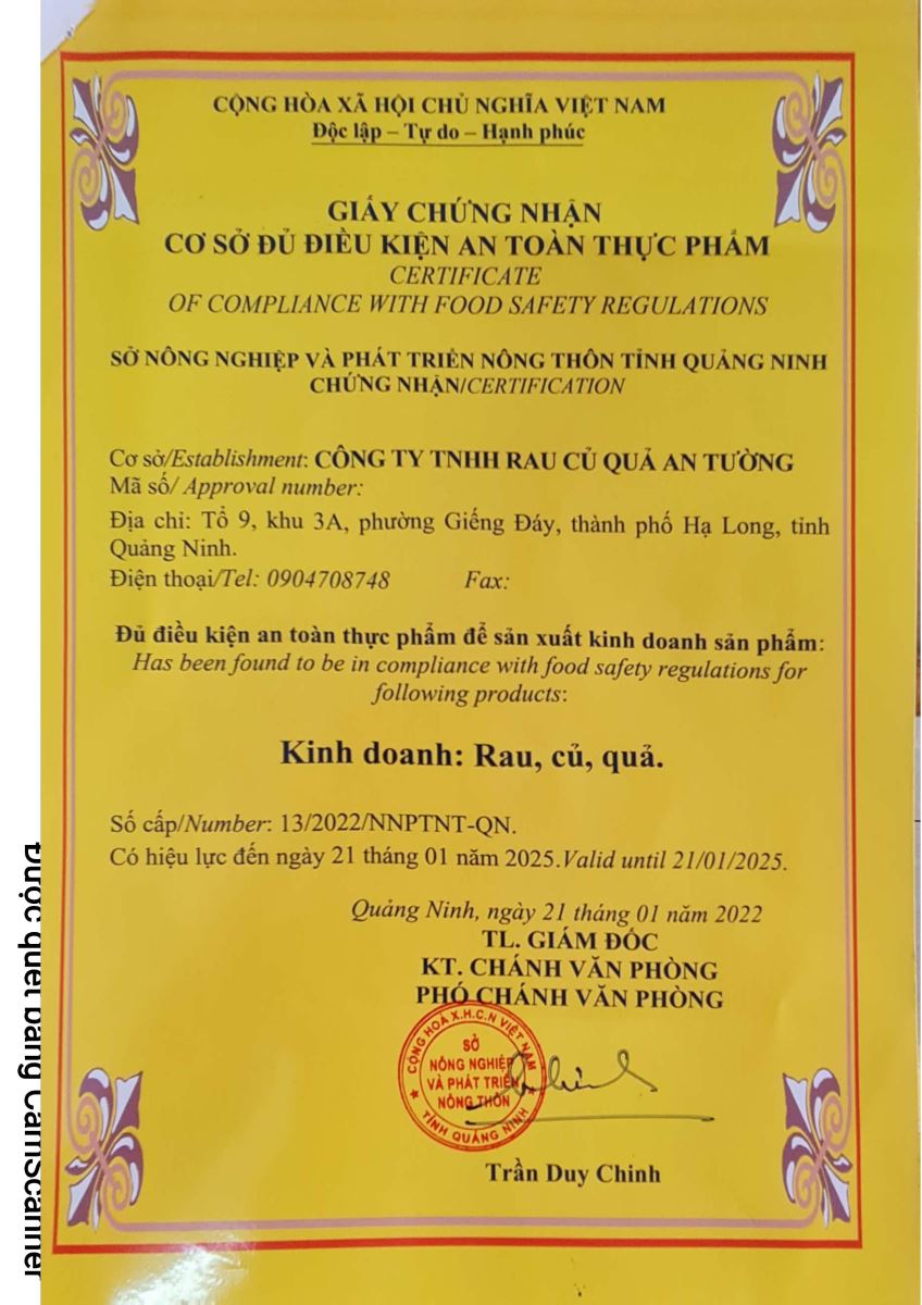 Tên đơn vị/nhà sản xuất: Công ty TNHH rau củ quả An Tường