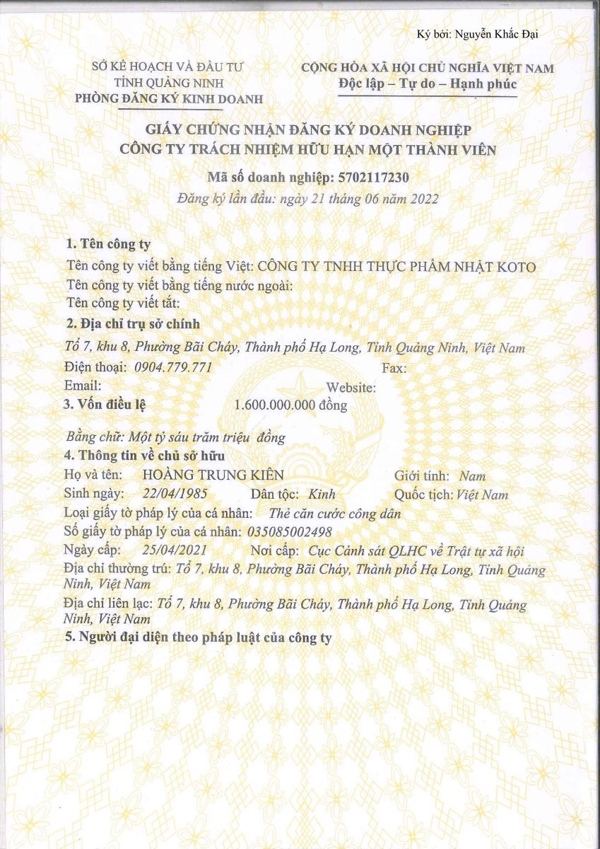 Tên đơn vị/nhà sản xuất: Công ty TNHH thực phẩm Nhật KOTO