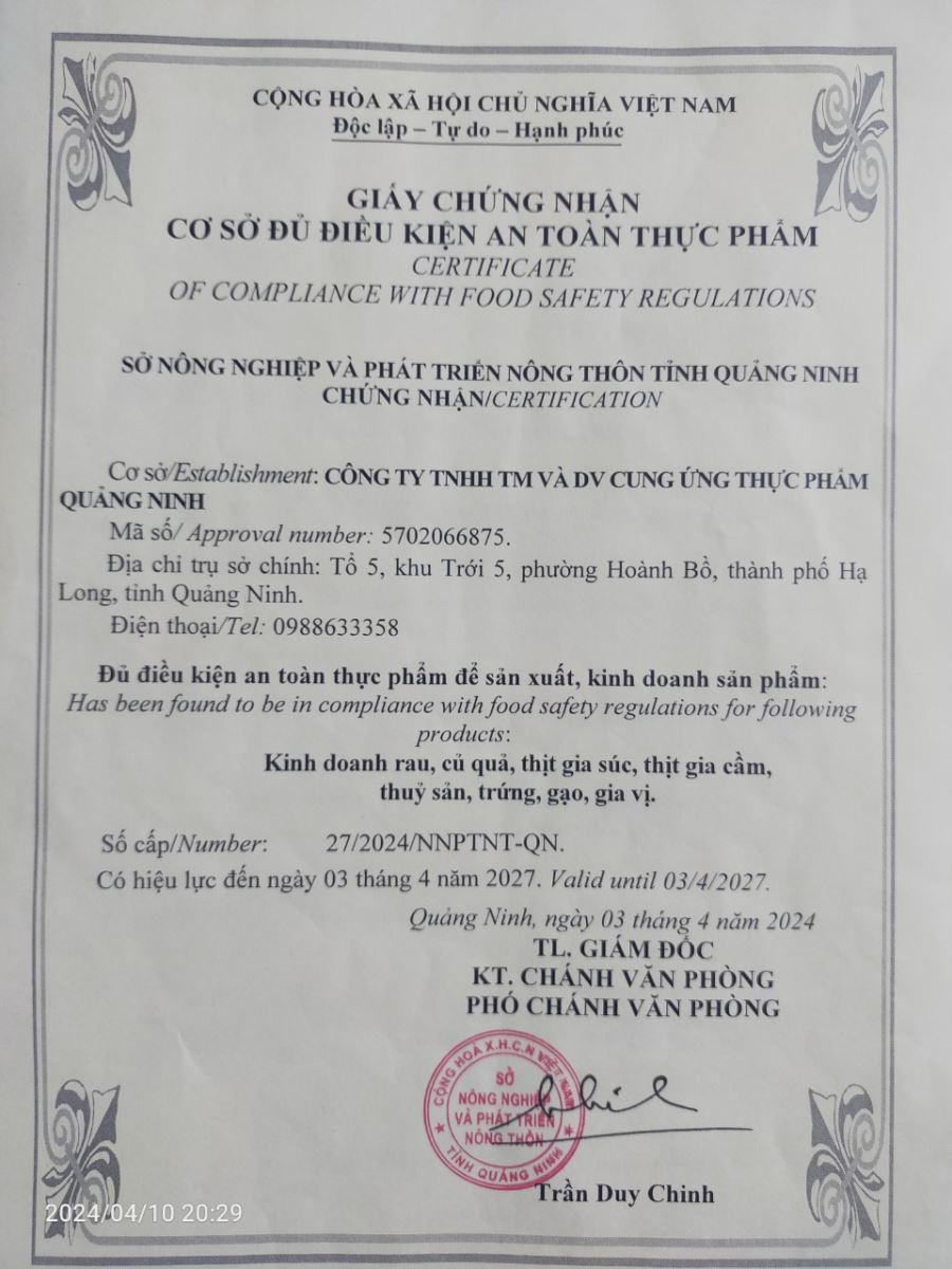 Tên đơn vị/nhà sản xuất: Công ty TNHH TM và DV cung ứng thực phẩm Quảng Ninh
