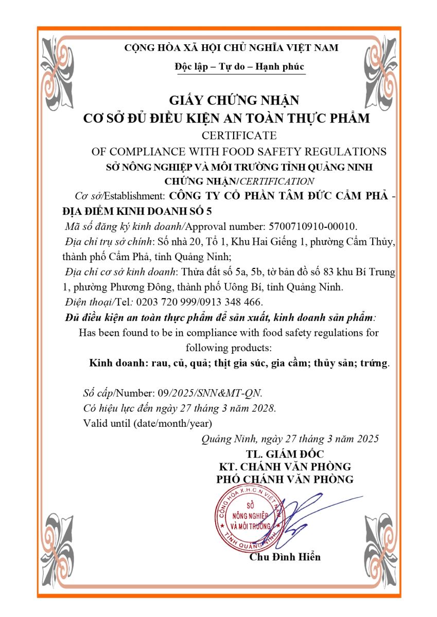Tên đơn vị/nhà sản xuất: Công ty cổ phần Tâm Đức Cẩm Phả - Địa điểm kinh doanh số 5