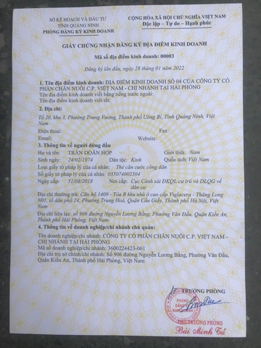 Tên đơn vị/nhà sản xuất: Công ty cổ phần nuôi C.P.Việt Nam - Chi nhánh Hải Phòng; Địa điểm kinh doanh số 04