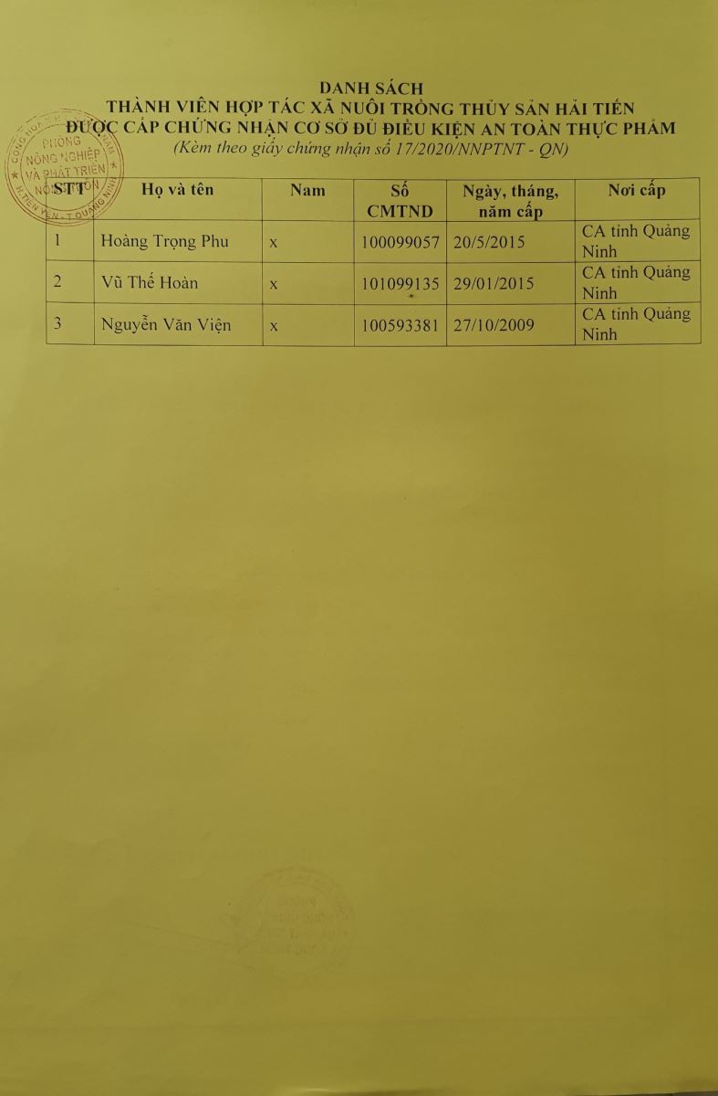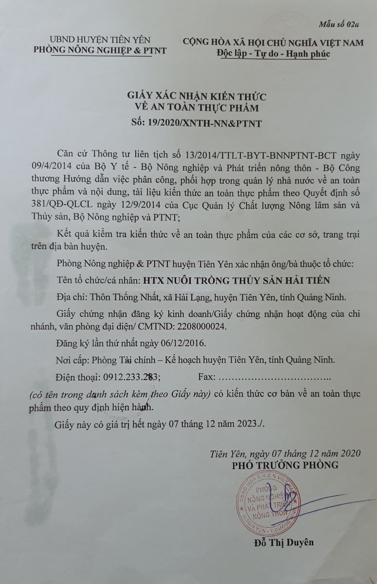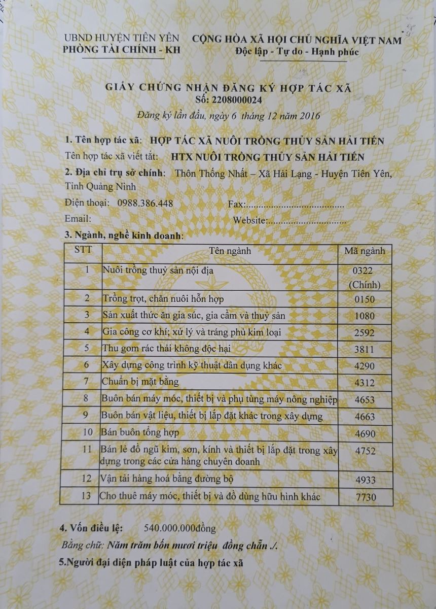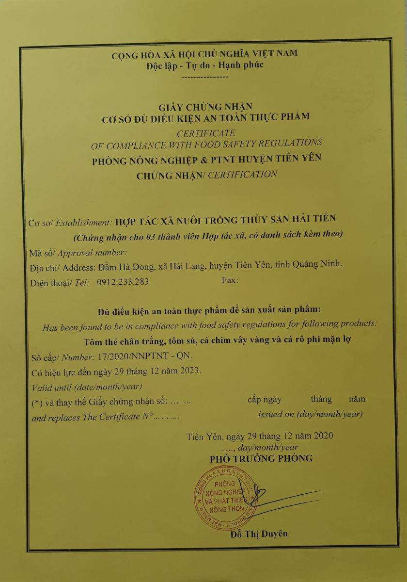 Tên đơn vị/nhà sản xuất: Hợp tác xã nuôi trồng thủy sản Hải Tiến
