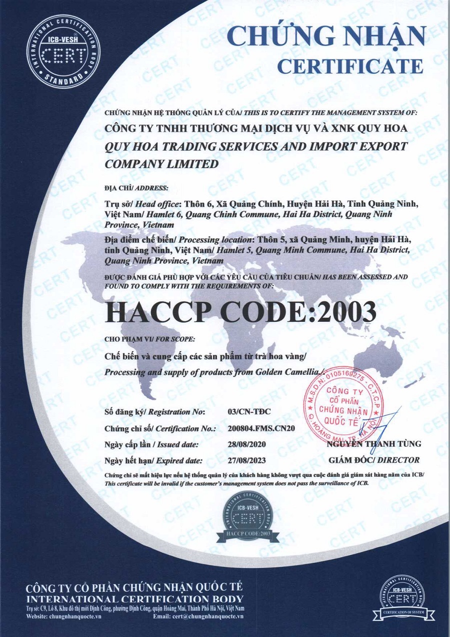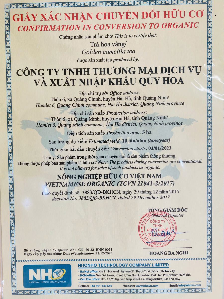 Trà Hoa Vàng Quy Hoa Quảng Ninh ( còn gọi: Quy Hoa Trà)  nổi tiếng khắp nơi bởi nguồn gốc và chất lượng. Cây sinh trưởng khỏe, lá đều, hoa to hơn với đặc tính dược lý cũng nhiều hơn.
