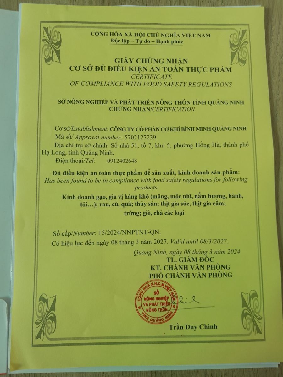 Tên đơn vị/nhà sản xuất: Công ty cổ phần cơ khí Bình Minh Quảng Ninh