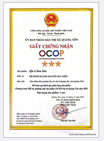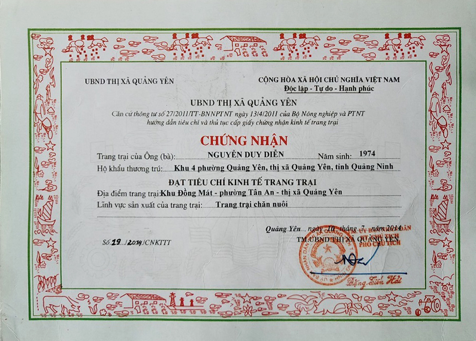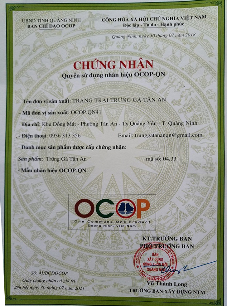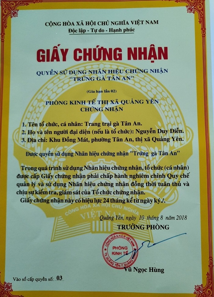 Tên đơn vị/nhà sản xuất: Trang trại sản xuất trứng gà Nguyễn Duy Diễn