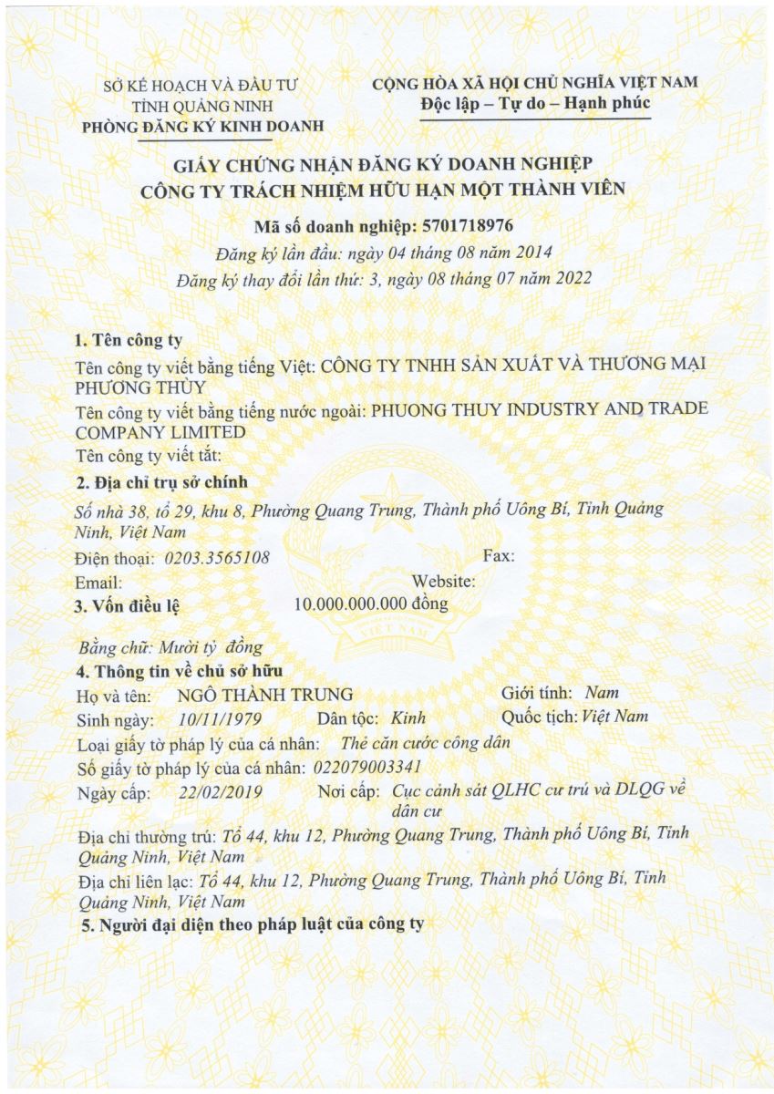 CSSX: Số Nhà 38 Tổ 29 Khu 8 Phường Quang Trung - TP. Uông Bí - Quảng Ninh