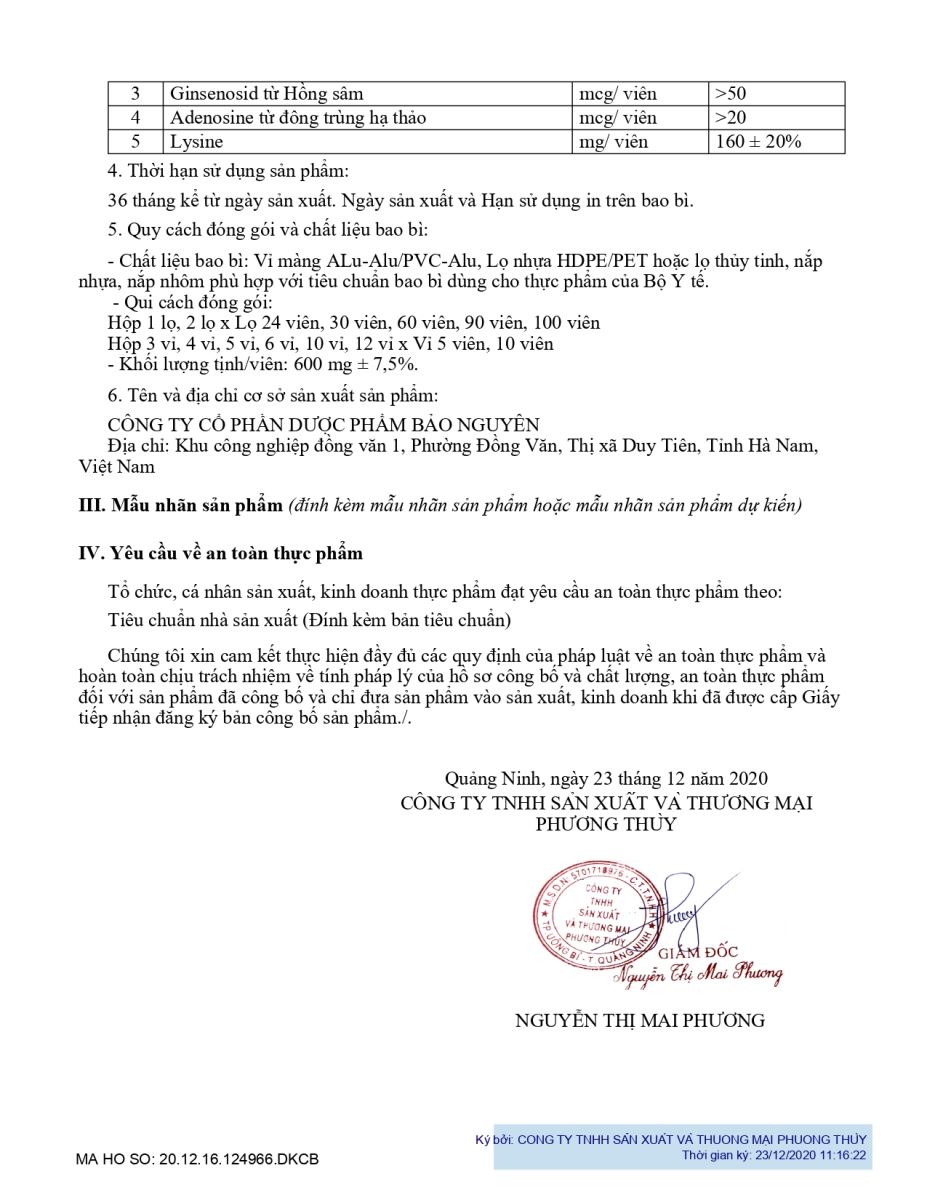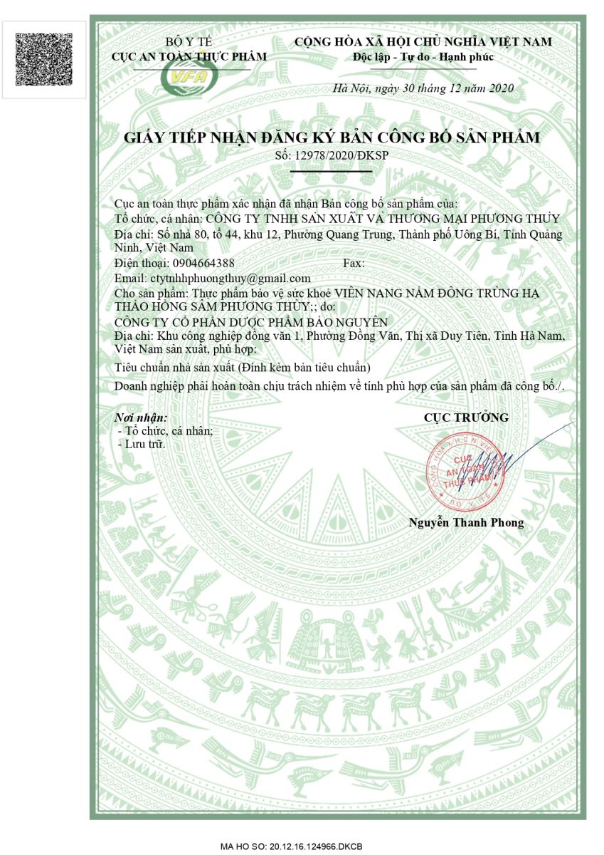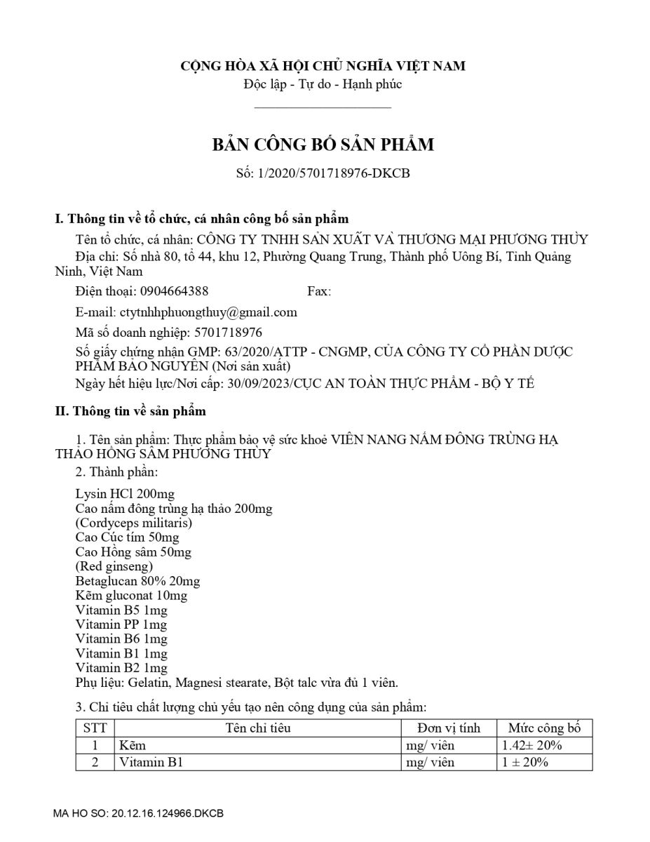 - Tên sản phẩm: Viên nang đông trùng hạ thảo hồng sâm Phương Thùy - (Cá thể: )