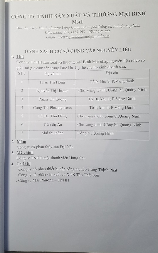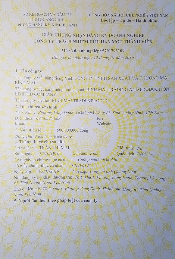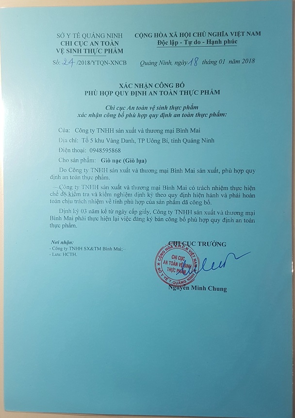 Tên đơn vị/nhà sản xuất: Công ty TNHH sản xuất & Thương Mại Bình Mai